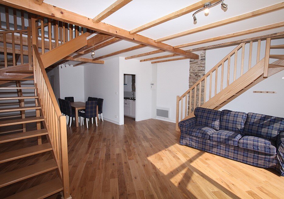 The core gîte space features glazed front doors set within a larger glass frontage and retains the ancient French oak barn doors. These lead to the open plan living area which, in addition to the great aspect, has warm real wood floors, exposed beams and the original stone walls. A large screen TV and DVD